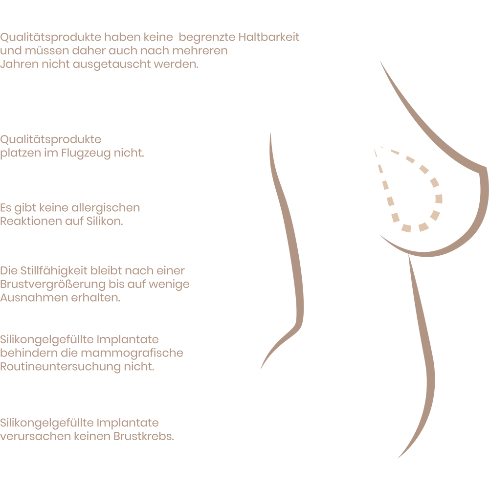 Ich verwende zur Brustvergrößerung ausschließlich Markenprodukte der neuesten Generation. Zu den Anforderungen für Implantate guter Qualität zählen unter anderem ein gut verträgliches Material, welches sich natürlich anfühlt und beständig ist. Silikongelimplantate haben eine texturierte Oberfläche. Sie bestehen aus einem sogenannten kohäsivem Gel, einer festen Füllung, die aufgrund ihrer Vernetzung nicht ausrinnen kann und sich trotzdem weich anfühlt.